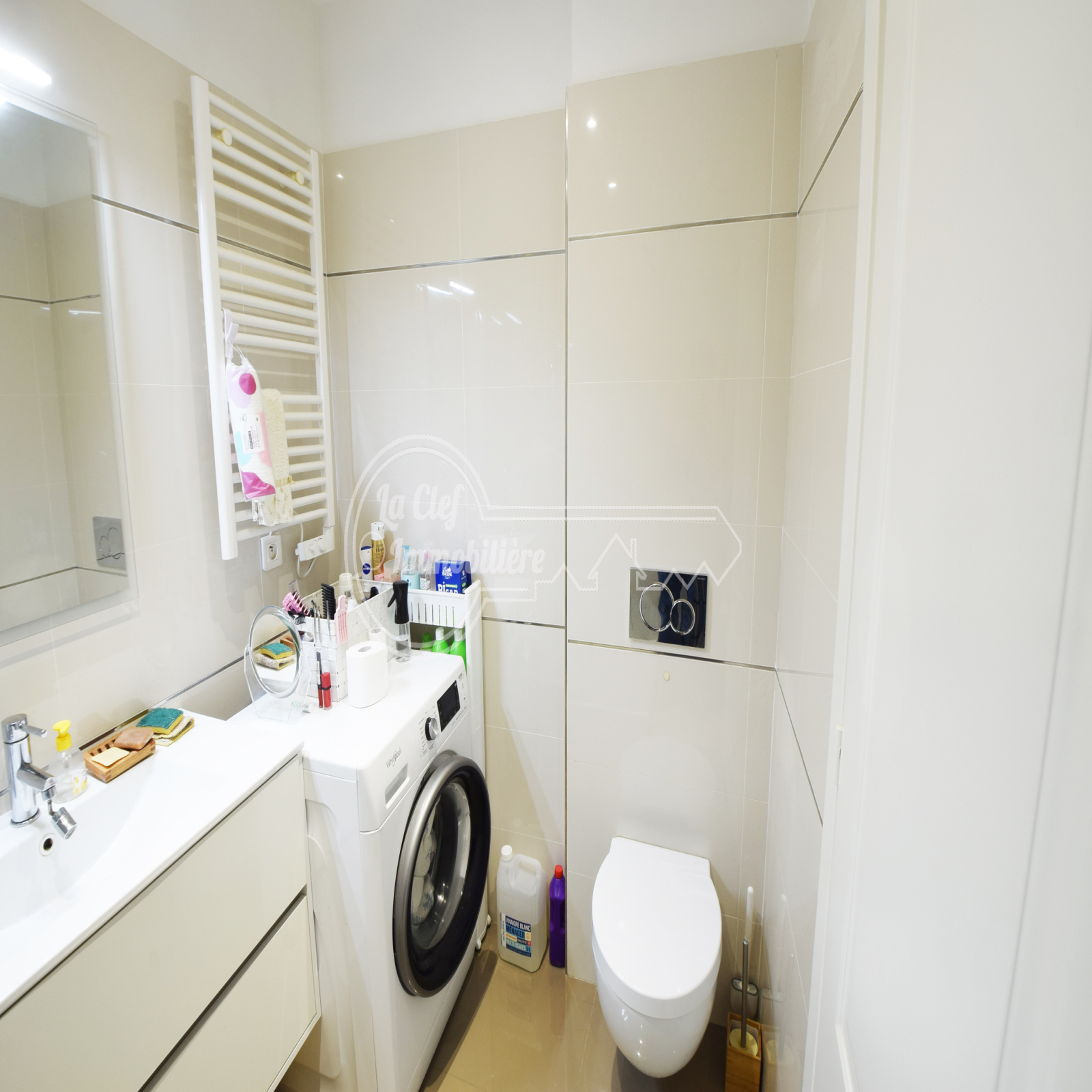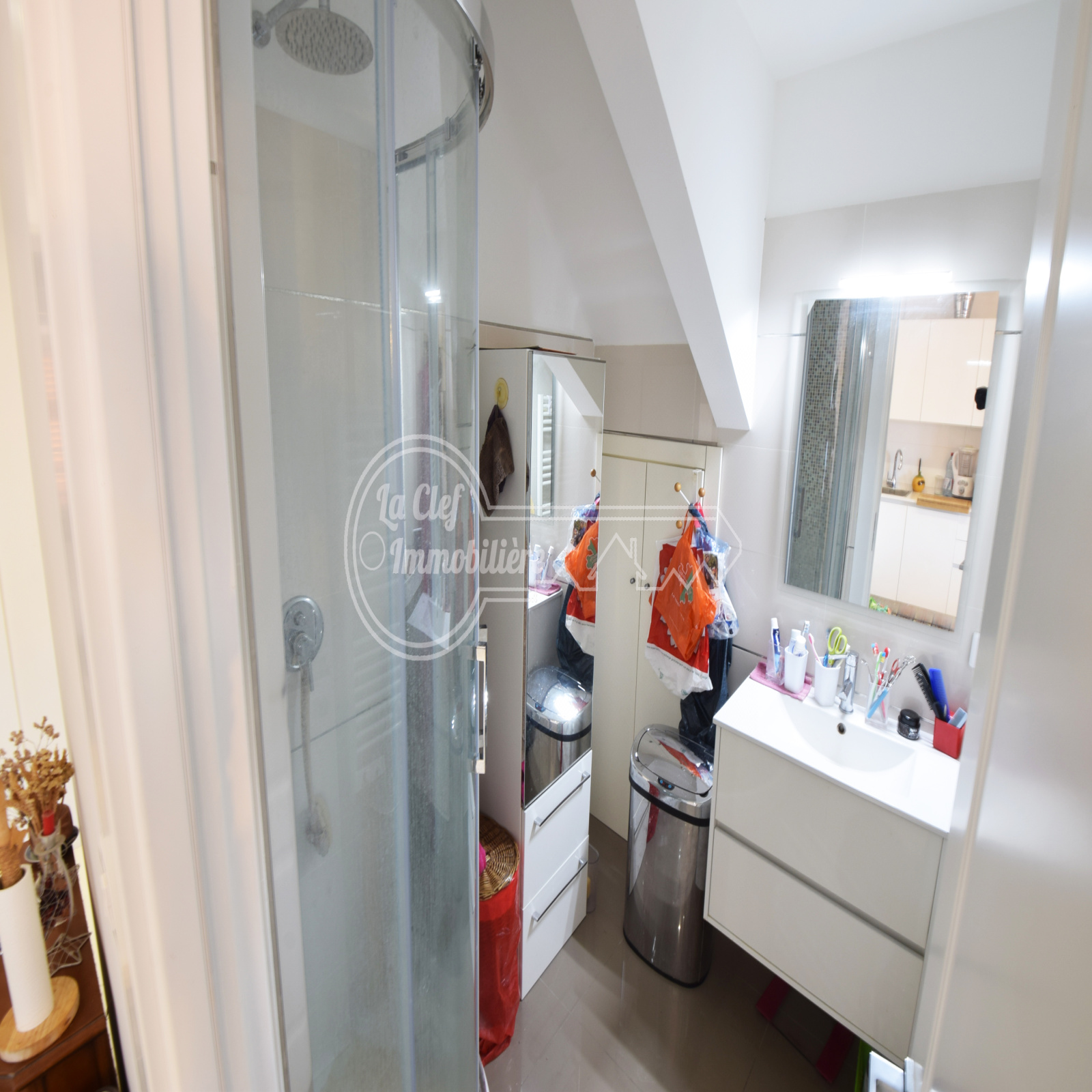 L’appartement dispose de deux salles d’eau : une avec douche à l’italienne et WC, une autre avec douche.